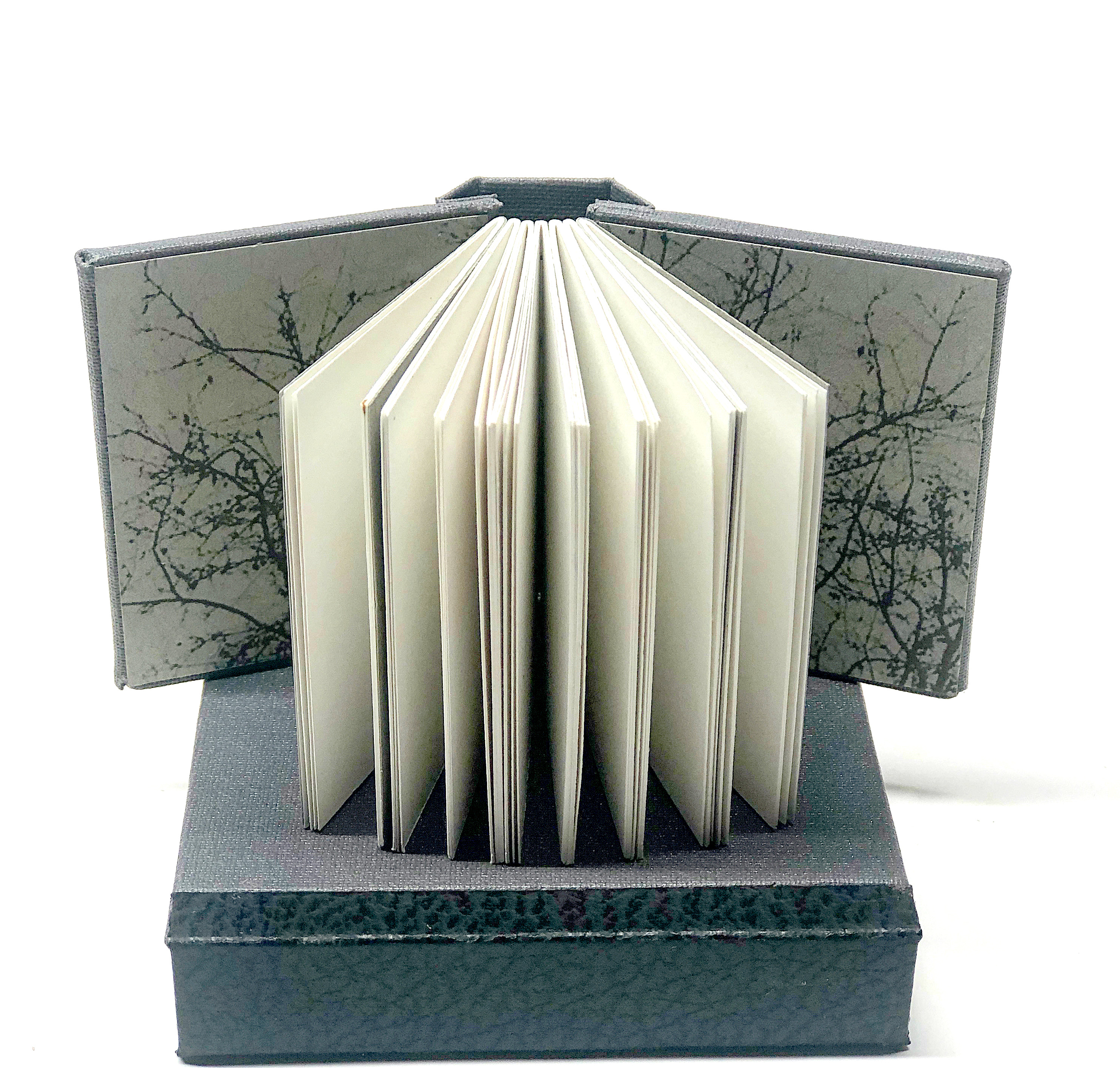 A meander book is a maze or spiral book that like a river makes its way through an area that is relatively flat, often developing bends as it makes its way through a path of least resistance. Once a meander starts, it often becomes more exaggerated. It is a type of “paper engineering” that allows a book to open in unexpected directions, creating a non-linear reading experience.